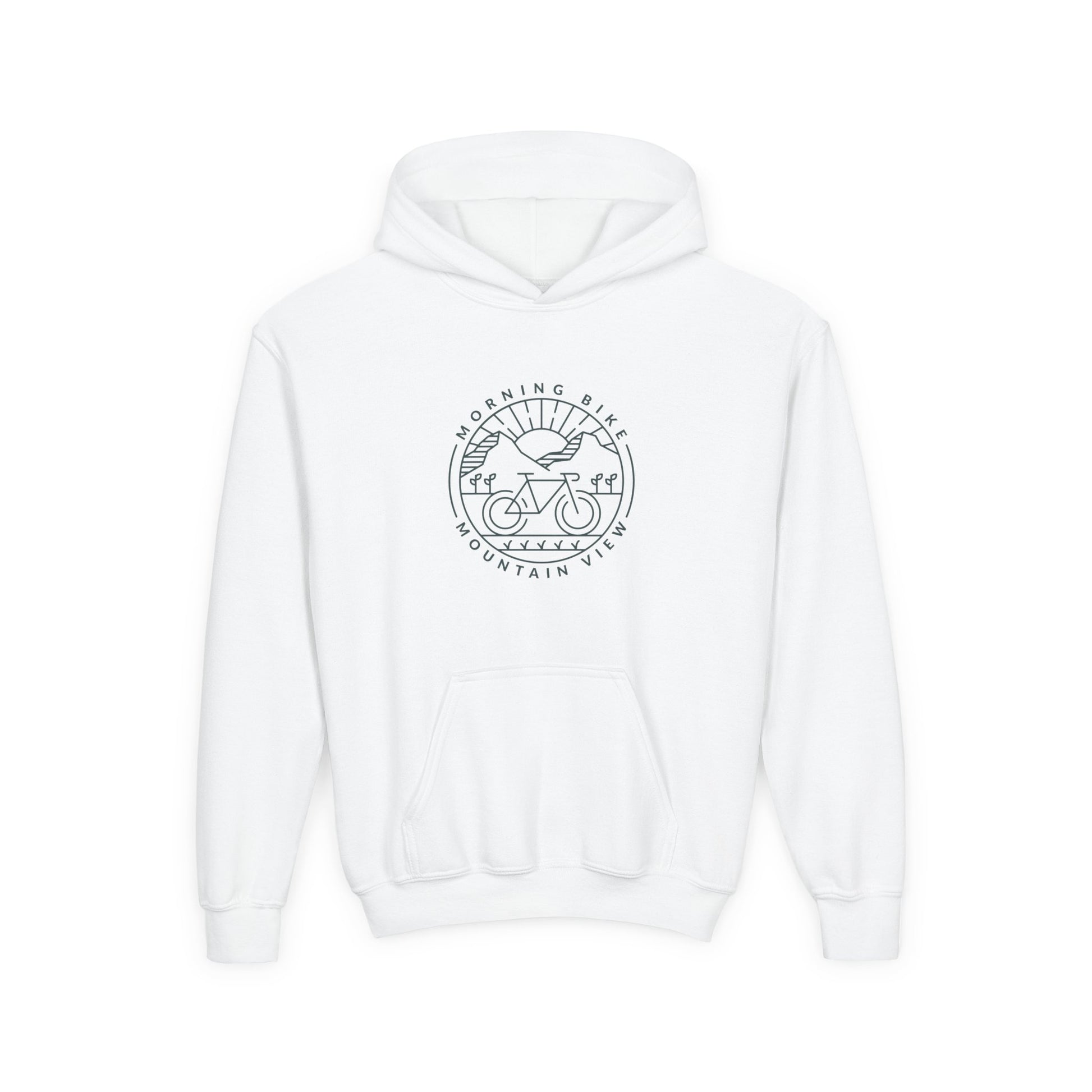 Morning Bike Mountain View graphic explorer design hoodie with a spacious kangaroo pocket for convenient storage and warmth. Made from a blend of 50% cotton and 50% polyester for a strong and smooth fabric, perfect for printing. Suitable for children, this hoodie is perfect for outdoor adventures and casual wear. Great for gifting during holidays like Christmas and birthdays.